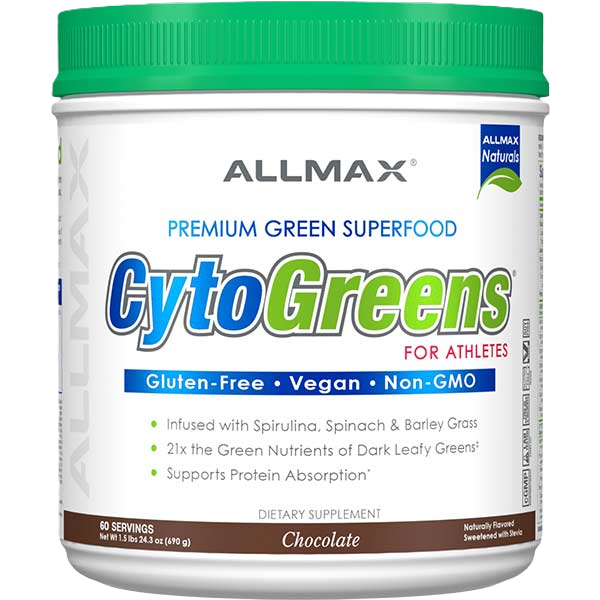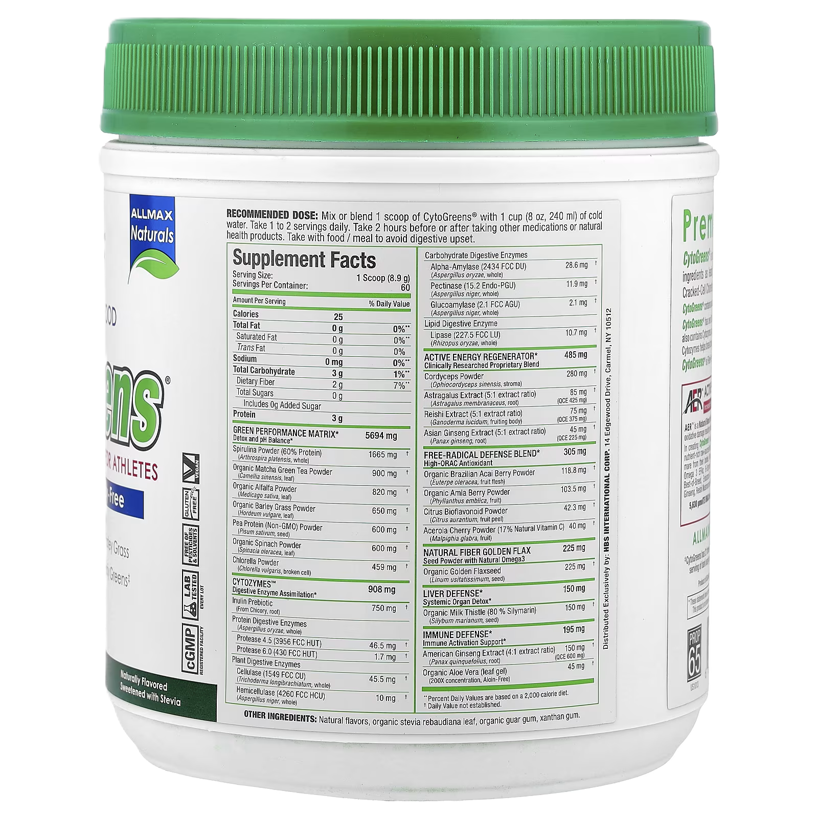 Cytogreens es un polvo de superalimentos verdes ultraconcentrado de primera calidad que contiene el doble de ingredientes verdes que otros suplementos líderes. Está repleto de superalimentos ricos en clorofila, como espirulina, clorela de células rotas y té verde matcha japonés de primera calidad. Su fórmula también incluye bayas ricas en antioxidantes y la exclusiva Green Performance Matrix para potenciar la recuperación y la eficiencia energética durante el ejercicio.