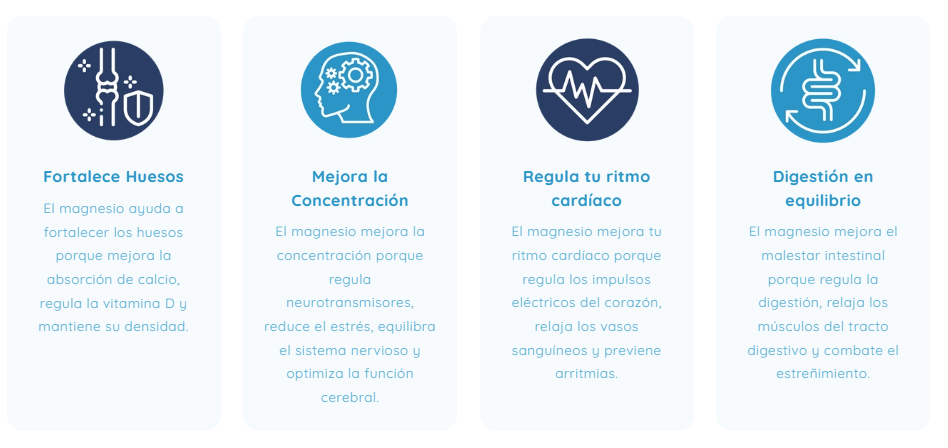 Diseñado para ayudar al cuerpo a recuperar los niveles de magnesio que se van perdiendo naturalmente ya que son vitales en 300 reacciones bioquímicas del organismo humano.