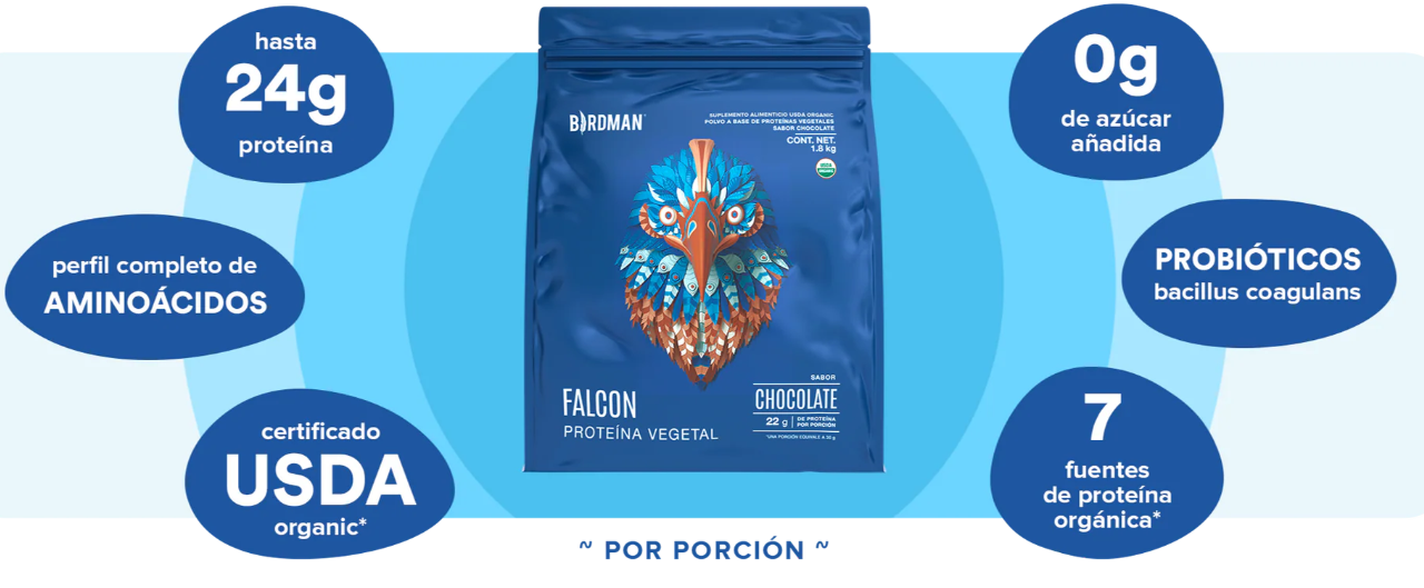 Falcon Protein está diseñada para apoyar tu ingesta de nutrientes diarios y está disponible en sabores orgánicos de chocolate y vainilla.