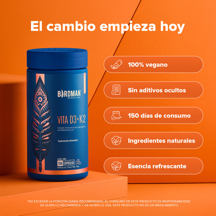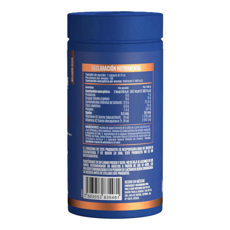 Nuestra fórmula única combina vitamina D3 con vitamina K2, complementada con inulina de agave natural. A diferencia de los suplementos tradicionales, nuestros ingredientes provienen exclusivamente de fuentes vegetales y fermentaciones naturales, siendo ideal para dietas veganas y vegetarianas.