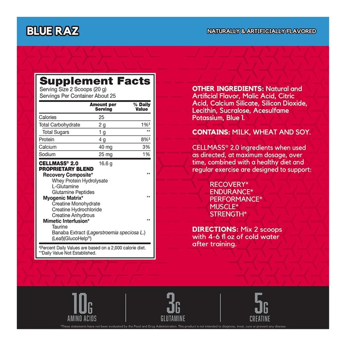 Cada porción de la fórmula de CELLMASS® 2.0 aporta 5 gramos de creatina, 3 g de glutamina y ácido glutámico, y 10 g de aminoácidos por porción, además de taurina y proteína de suero hidrolizada.