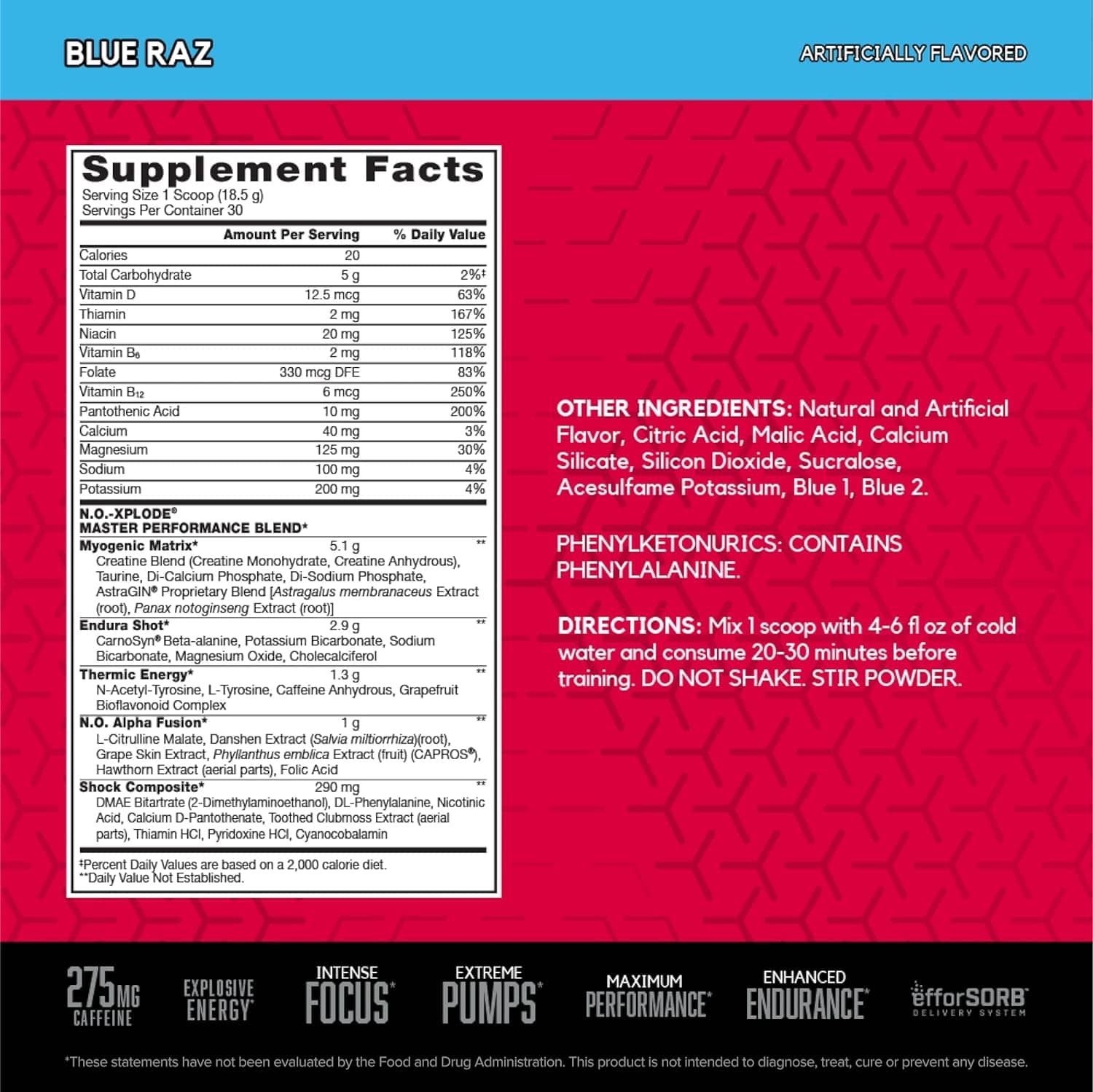 Domina tus entrenamientos con NO-XPLODE, la legendaria fórmula pre-entrenamiento que ayuda a los atletas a ser el centro de atención dentro y fuera del gimnasio. Con energía explosiva, sensación, concentración y un sabor increíble, NO-XPLODE está diseñado para atletas de todos los niveles. Cada porción de NO-XPLODE aporta 275 mg de cafeína, 1.8 g de beta-alanina y una concentración extrema.