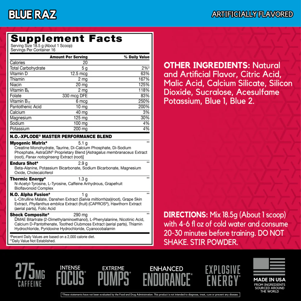 Domina tus entrenamientos con NO-XPLODE, la legendaria fórmula pre-entrenamiento que ayuda a los atletas a ser el centro de atención dentro y fuera del gimnasio. Con energía explosiva, sensación, concentración y un sabor increíble, NO-XPLODE está diseñado para atletas de todos los niveles. Cada porción de NO-XPLODE aporta 275 mg de cafeína, 1.8 g de beta-alanina y una concentración extrema.