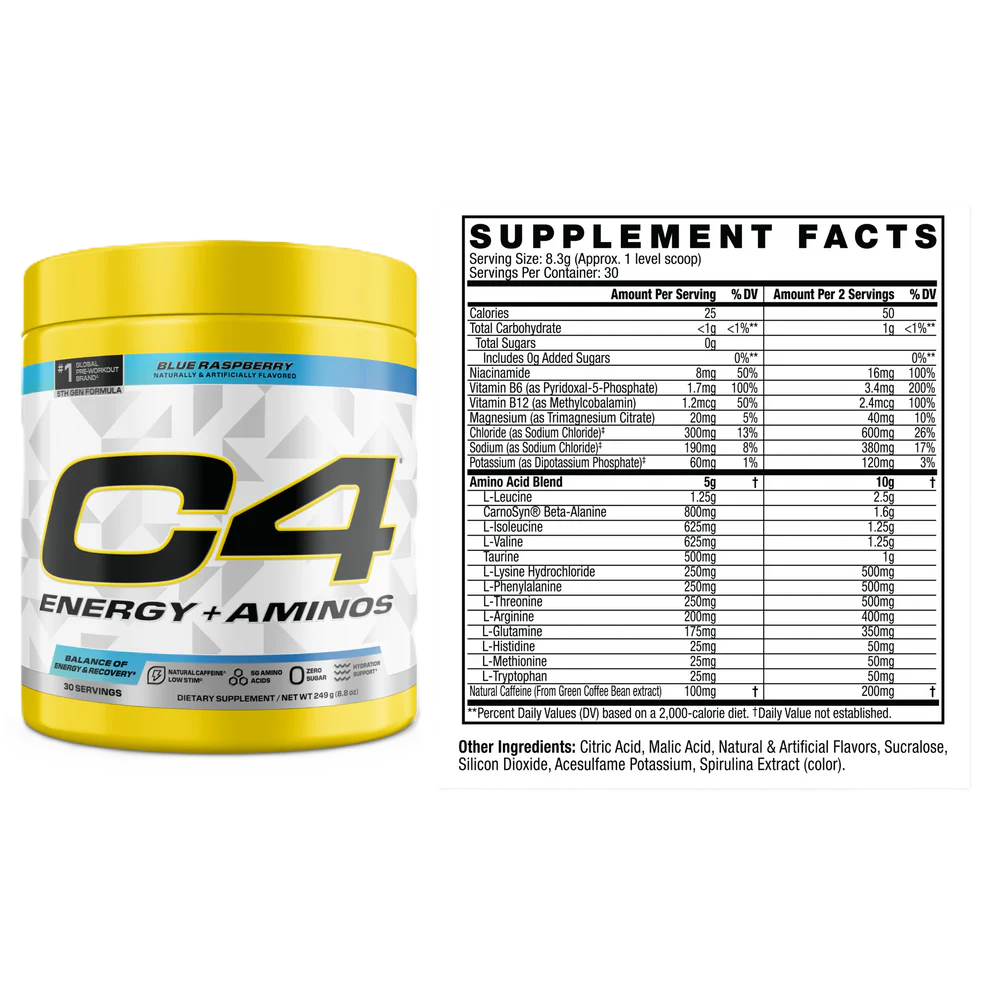 Cada cucharada contiene 100 mg de cafeína de granos de café verde para aumentar los niveles de energía y favorecer la concentración. 5 g de aminoácidos, incluyendo BCAA y EAA, favorecen el crecimiento y la reparación muscular, junto con 3 electrolitos esenciales. Elaborado sin azúcar, C4 Energy + Aminos es una forma deliciosa y refrescante de mejorar tu día a día.