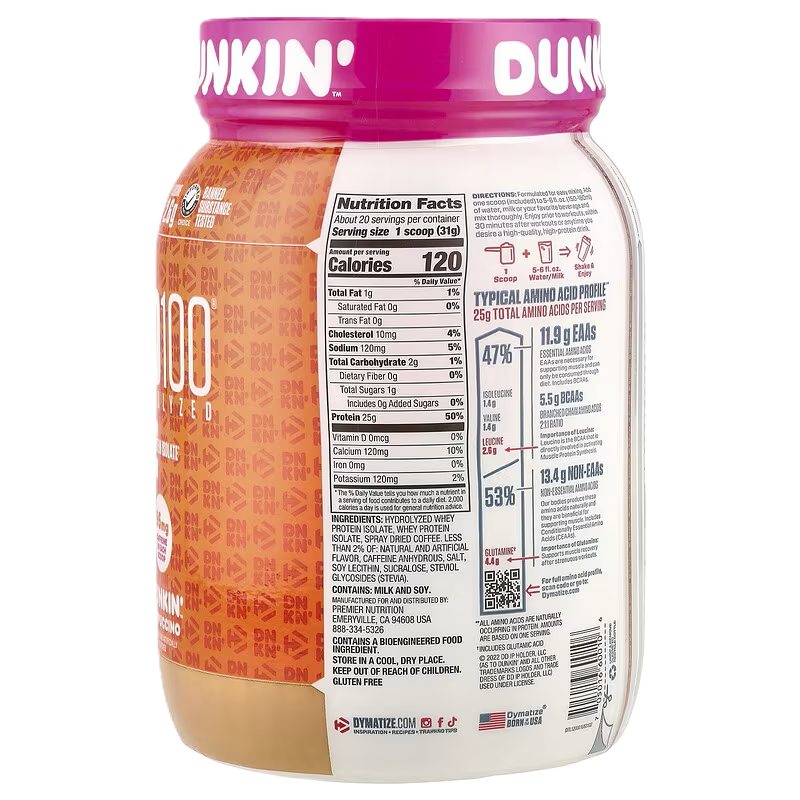 Dale más duro y apoya la recuperación muscular después de un entrenamiento intenso con la absorción y digestión ultrarrápidas de ISO 100. Una de las proteínas en polvo de mayor calidad del mercado, filtrada para eliminar el exceso de lactosa, carbohidratos, grasas y azúcares, para una mezclabilidad y ganancias máximas. No te limites a superar tus mejores marcas. ¡Acaba con todo con el sabor icónico de ISO 100 en sabor a dona glaseada DUNKIN’® !