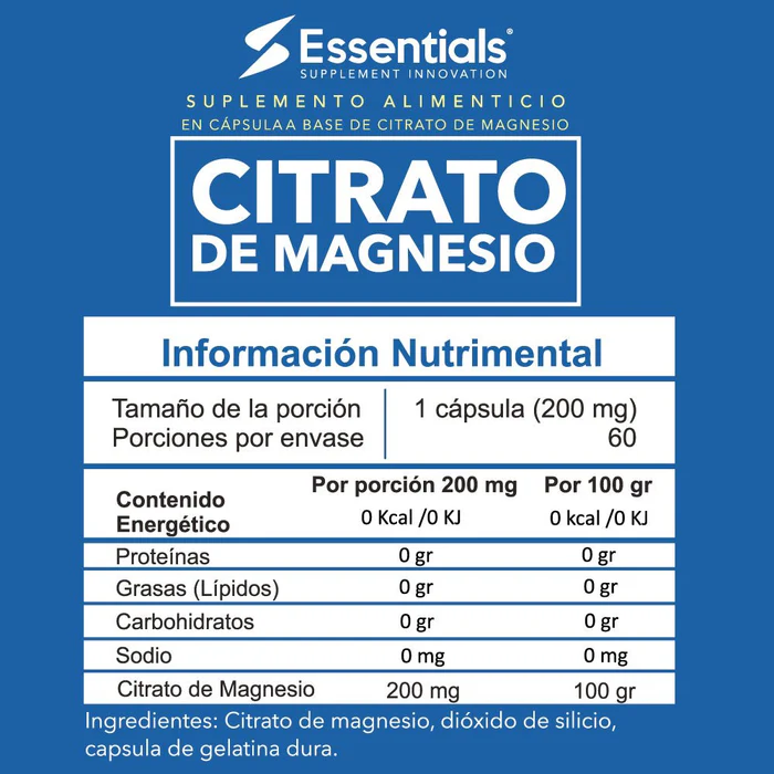 Suplemento de Citrato de Magnesio (200 mg por cápsula), una de las formas con mayor biodisponibilidad de este mineral esencial. Apoya la función muscular, el equilibrio energético y la salud ósea.