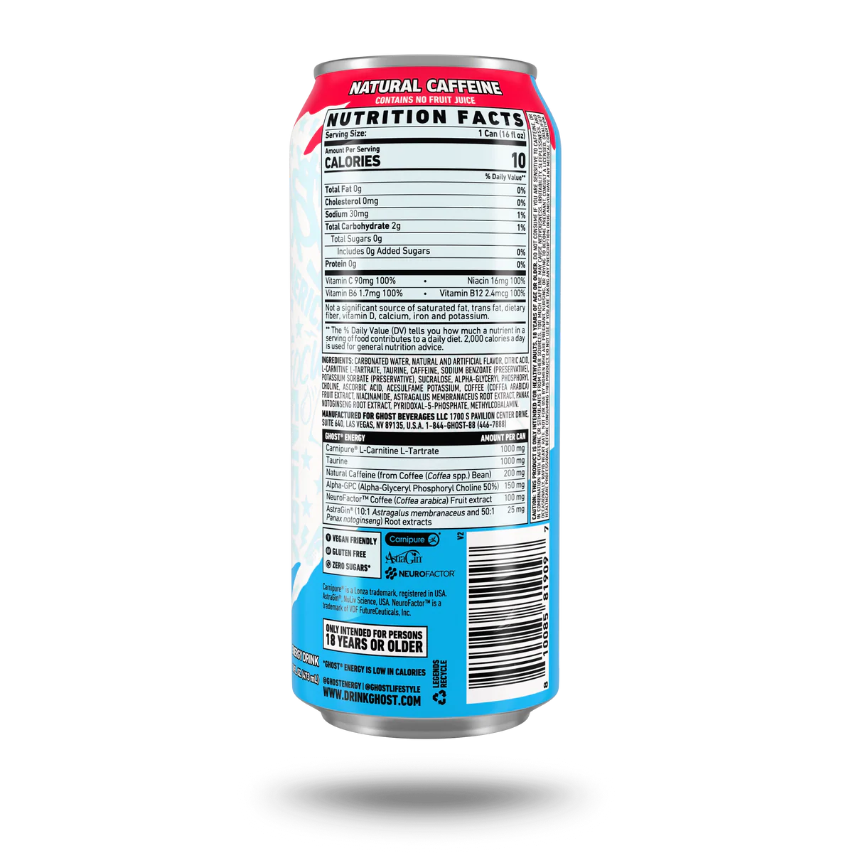 GHOST ENERGY es la bebida totalmente transparente y cargada de energía que todos hemos estado esperando. Sin azúcar. Sin colores artificiales. contiene 200 mg de cafeína natural de granos de café anecdóticamente proporciona una energía suave y agradable con menos nerviosismo y sin desplome de la energía.