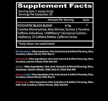 Psychotic Black es la última incorporación a la familia Psychotic de fórmulas pre-entrenamiento de Insane Labz. Es un Pre-entrenamiento de estímulo moderado, que proporciona solo la energía suficiente para hacer el trabajo , es de efecto rápido y suave por los que es conocida toda nuestra línea psicótica..
