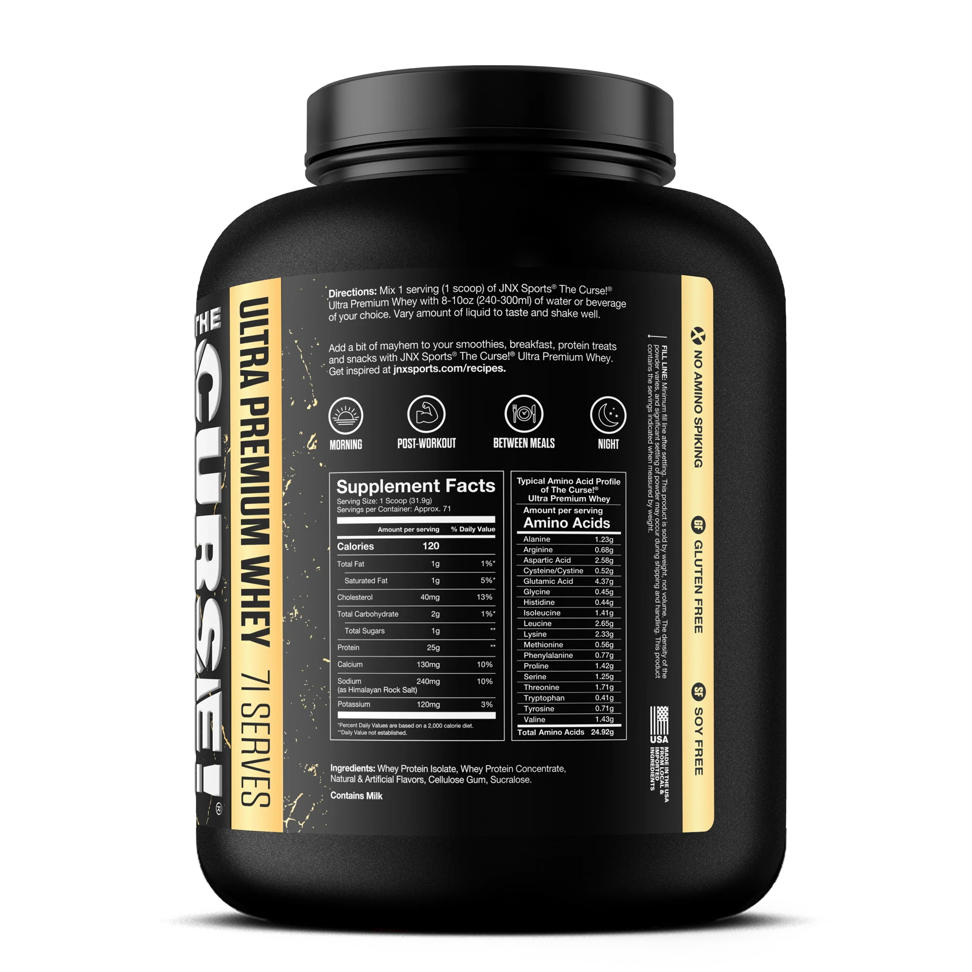 Cada cucharada épica de The Curse! Ultra Premium Whey aporta 25 g de proteína de suero premium, principalmente de aislado de proteína de suero.