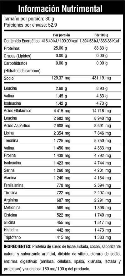 100% de Proteína de Suero de Leche Aislada, elaborada con la mayor pureza y calidad para complementar tu alimentación. Cada uno de sus servicios contiene 25gr de proteína de suero de leche aislada y 5.5gr de BCAAs(Aminoácidos de Cadena Ramificada) que en conjunto trabajan para la generación de musculatura y aceleran la recuperación, tambien contiene Enzimas Digestivas que aceleran el proceso de absorción de los compuestos. 0 Zero Carbohidratos, ¡Sin impurezas! ¡Solo lo MEJOR!