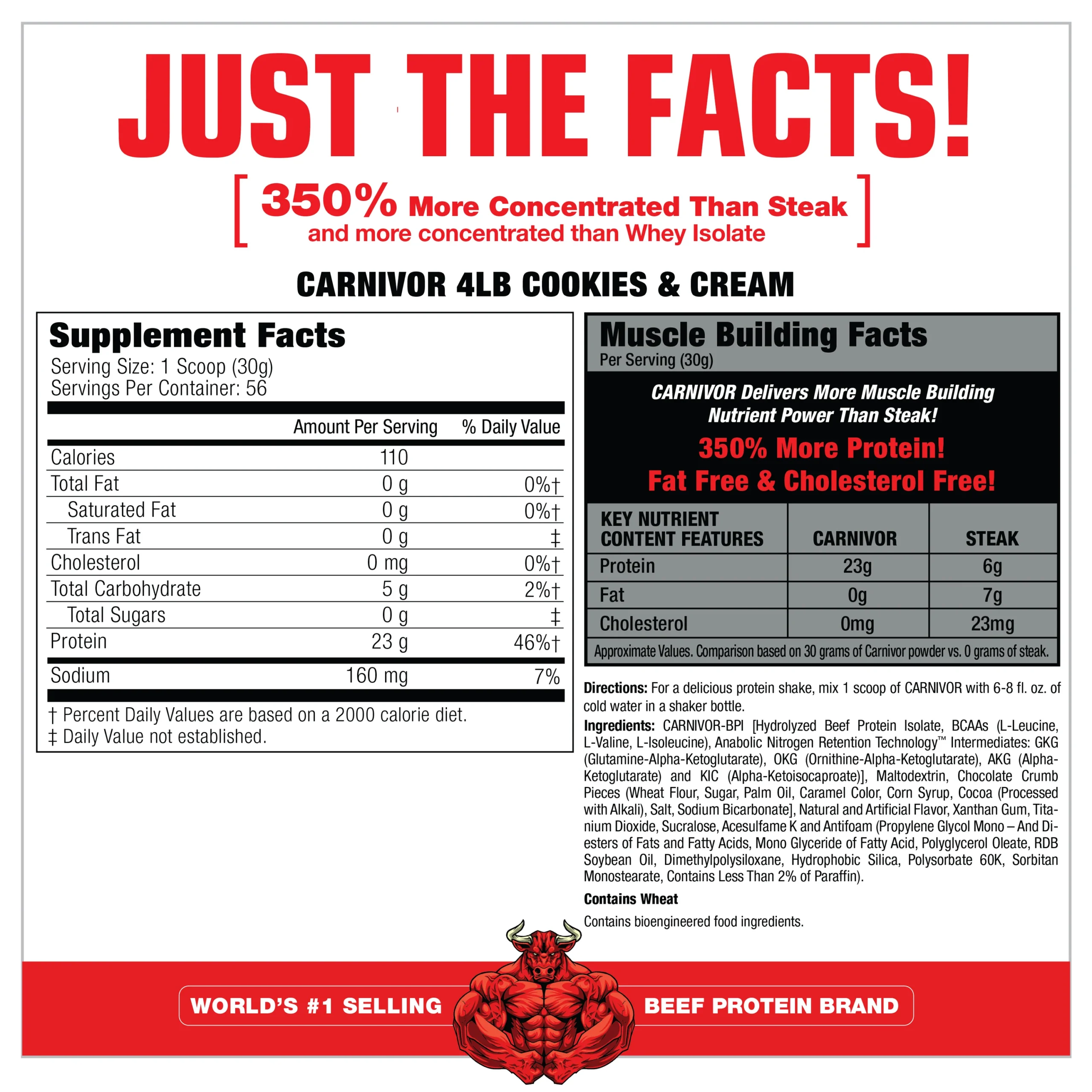 El aislado de proteína de res CARNIVOR ofrece todo el poder de desarrollo muscular de la carne de res con mayores niveles de aminoácidos que otras fuentes de proteína utilizadas en suplementos, como el suero de leche, la soja, la leche y el huevo. ¡El aislado de proteína de res CARNIVOR (BPI) tiene incluso un 350 % más de concentración en aminoácidos anabólicos para el desarrollo muscular que un solomillo de primera! Además, ¡no contiene azúcar, grasa, lactosa ni colesterol! ¡Sin mencionar que CARNIVOR es uno de los batidos de proteínas más deliciosos que jamás probarás!
