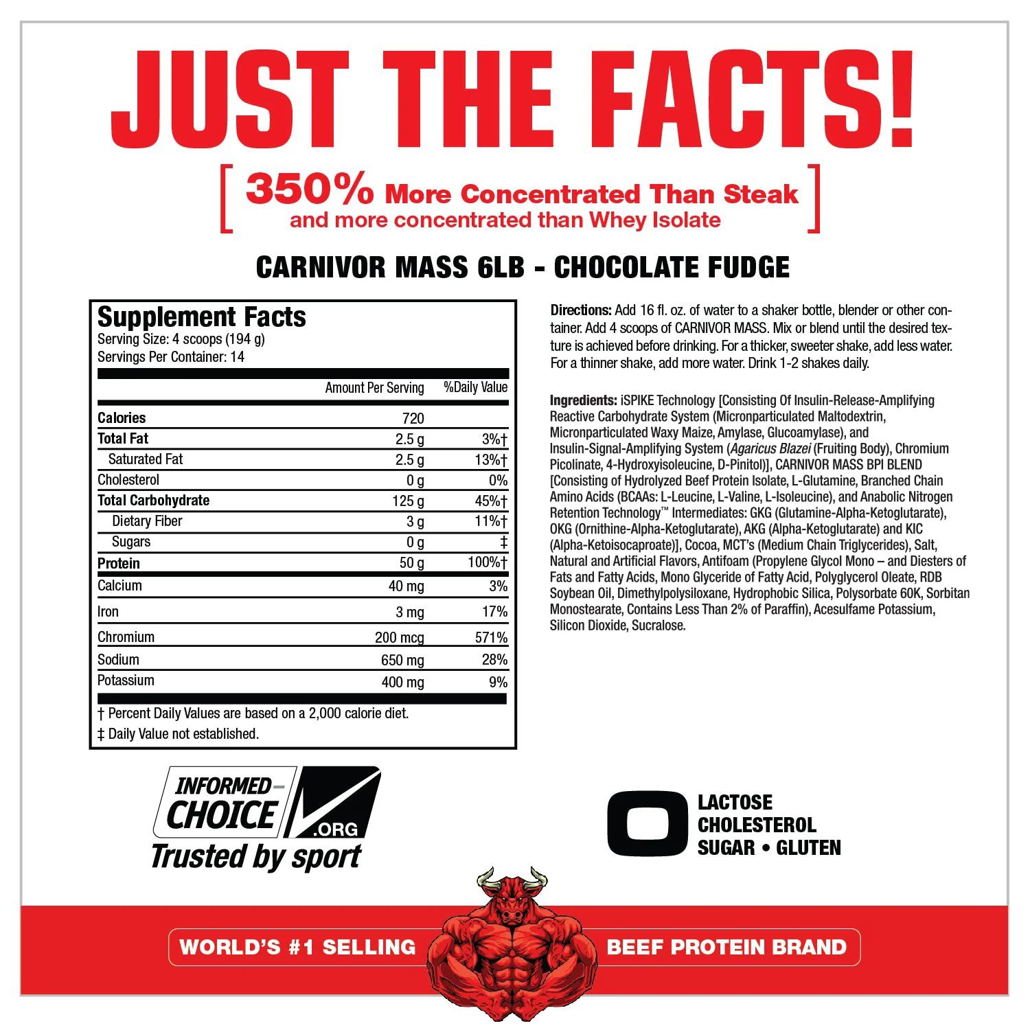 Aislado de proteína de res: Aprovecha el poder de desarrollo muscular de la carne de res sin grasa ni colesterol con un 99% de aislado de proteína de res pura. Hidrolizado y altamente concentrado en aminoácidos, CARNIVOR BPI es una excelente alternativa sin lactosa al suero de leche. Esta proteína revolucionaria tiene un 350 % más de concentración de aminoácidos que la carne de res y está clínicamente comprobado que desarrolla músculo. Cada porción de CARNIVOR MASS proporciona 50 gramos de aislado de proteína de res con 0 grasas, 0 colesterol y 0 lactosa, lo que la convierte en la fuente de proteína definitiva para que los atletas fomenten el desarrollo y la recuperación muscular.