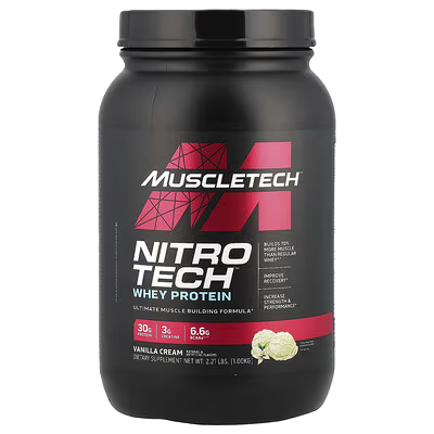 Nitro-tech Performance Series de Muscletech es un suplemento de asilado de proteína de suero diseñado para construir músculo libre de grasa. Nitro Tech es una proteína a base de suero de leche micro filtrada, conteniendo 24 gramos de proteínas, 5.5 gramos de BCAA, 4 gramos de glutamina, 2 gramos de azúcar y 2 gramos de carbohidratos.