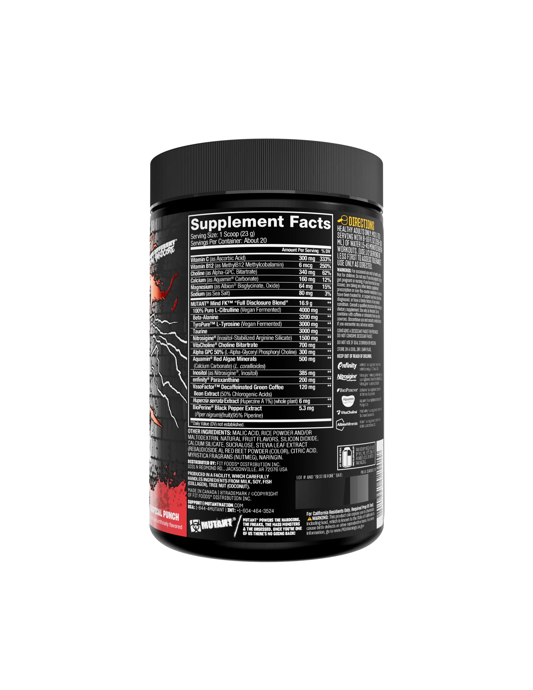 MUTANT® MIND FK es una experiencia de entrenamiento nootrópica, innovadora y audaz. Este producto, con respaldo científico, proporciona la concentración y el flujo muscular necesarios para superar el fallo muscular y conseguir más repeticiones.