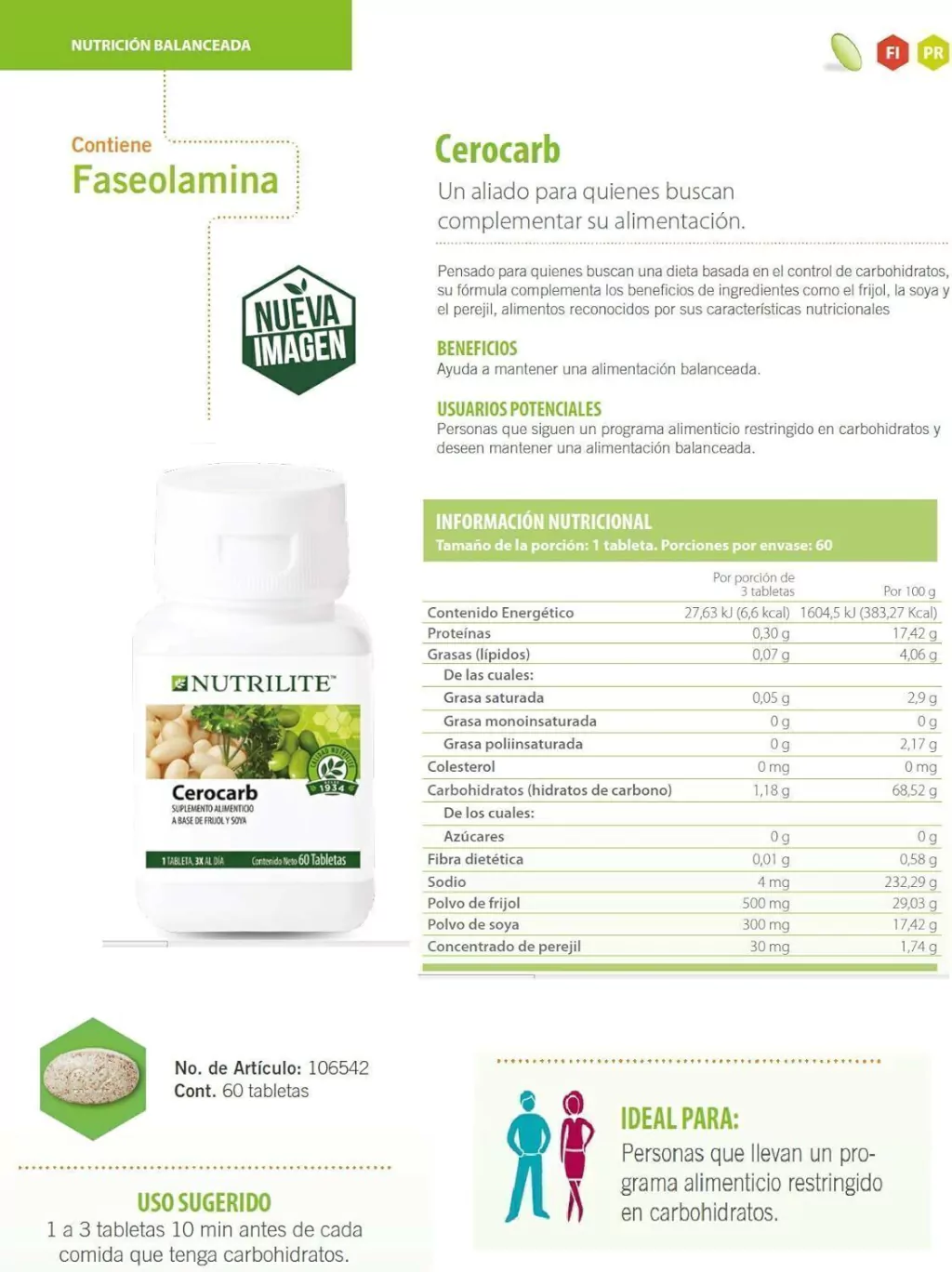 Es un suplemento alimenticio que ayuda a inhibir la digestión de carbohidratos como azúcares sencillos y almidón, componentes de la dieta habitual y cuyo consumo excesivo está vinculado al desbalance nutricional contribuyendo al sobrepeso, obesidad y diabetes. Sus componentes ayudan a inhibir la digestión de sacarosa, un azúcar simple que está presente en el azúcar de mesa, los postres, las frutas y otros alimentos, así como la digestión de carbohidratos complejos, ricos en almidón, harinas refinadas, cereales, pasta, arroz, papa, maíz, etc. Este complemento aporta nutrientes como el frijol y la soya para un programa de alimentación balanceada, especialmente baja en carbohidratos, en combinación con una rutina de ejercicio. El extracto de frijol tiene un tipo de proteína que en combinación con el polvo de frijol de soya ayuda a inhibir la absorción de calorías de carbohidratos como el almidón en los alimentos.