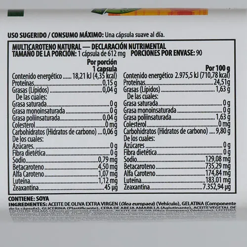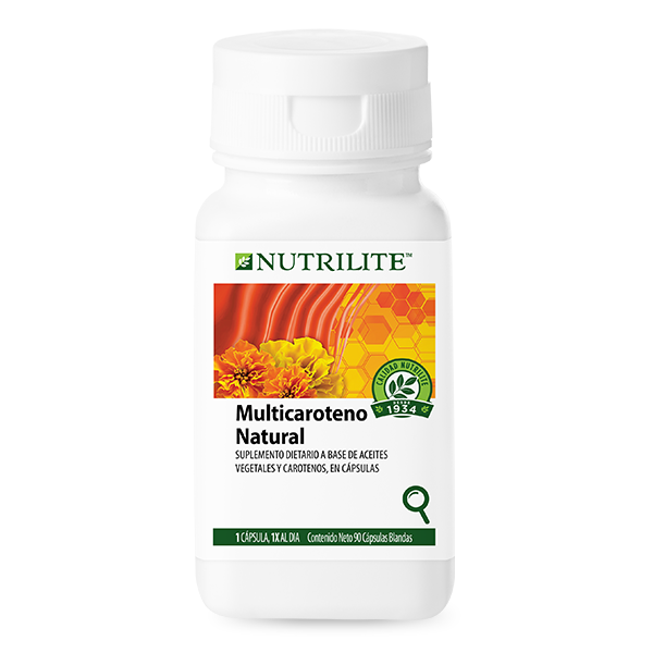 Suplemento que contiene alfa y beta carotenos, luteína y zeaxantina. Su combinación incluye compuestos de carotenoides naturales provenientes de algas, aceites de fruta de palma y flores de cempasúchil.