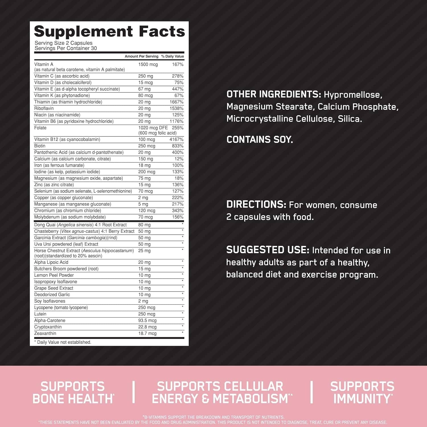 OPTI-WOMEN es más que un multivitamínico. Es un sistema de optimización de nutrientes que proporciona 40 ingredientes activos, incluyendo 23 vitaminas y minerales, diseñados para satisfacer las necesidades nutricionales de las mujeres activas. Cada porción de 2 cápsulas proporciona un amplio aporte nutricional en cápsulas vegetarianas aprobadas por la Sociedad Vegetariana.¹