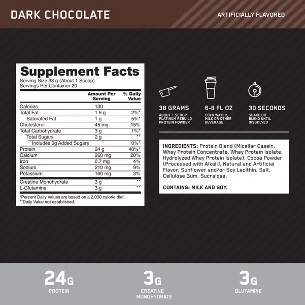 Con deliciosos sabores, una consistencia satisfactoria y una fácil mezcla con un vaso mezclador, Platinum REBUILD cumple y supera los estrictos estándares de calidad que espera de Optimum Nutrition, la marca de nutrición deportiva n.° 1 del mundo. 4