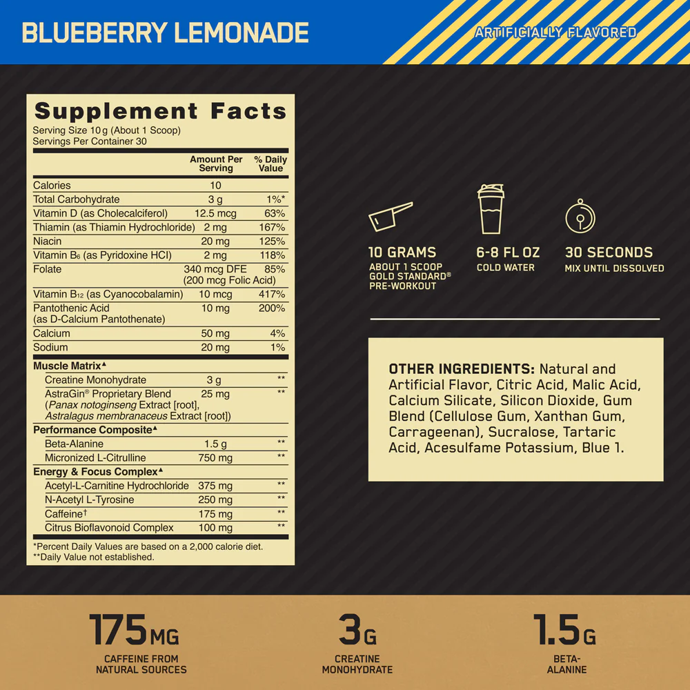 GOLD STANDARD Pre-Workout combina cafeína con monohidrato de creatina y beta-alanina para ayudarte a liberar energía, concentración, rendimiento y resistencia. Ya sea que tu objetivo sea alcanzar la cima, arrasar en la siguiente serie o completar la última repetición, obtén tu energía con el pre-entrenamiento de una de las marcas más confiables en nutrición deportiva.