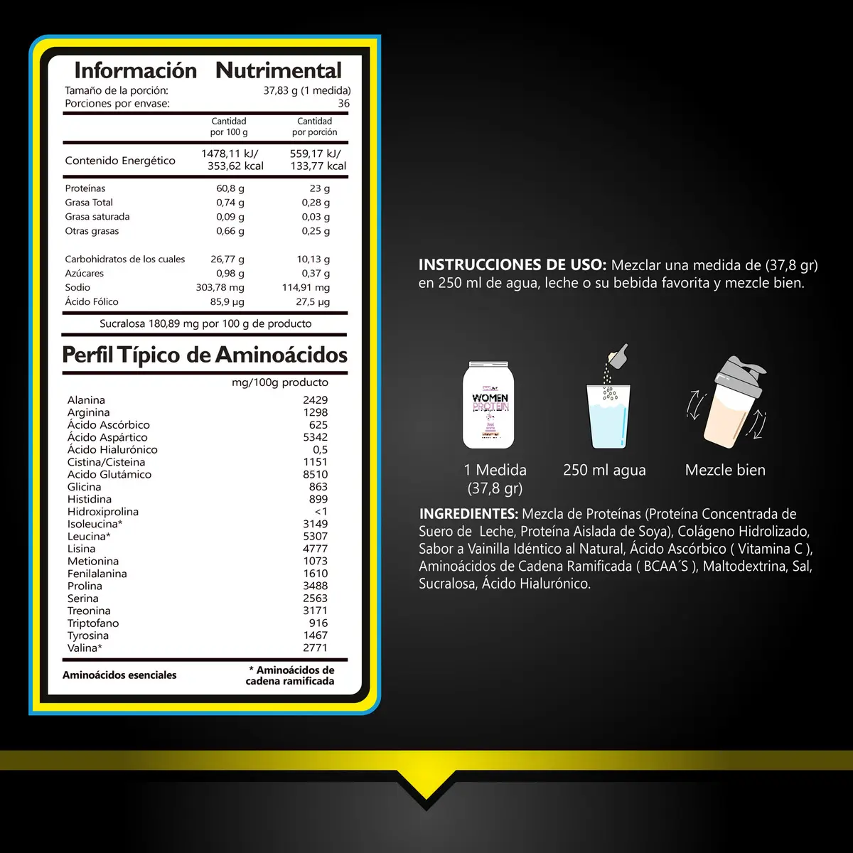 Proteína de suero de leche adicionada con ingredientes específicamente diseñados para las necesidades de la mujer, como BCAA’S, Ácido Hialurónico, Vitamina C, Colágeno Hidrolizado. La proteína en las mujeres es fundamental para las funciones importantes, cuantas más actividades realices, mayor cantidad de nutrientes y proteínas necesitas aportar a tu organismo. Un delicioso batido de proteína saludable puede ser una forma divertida y rápida de obtener las proteínas, vitaminas y minerales que el cuerpo de una mujer necesita.