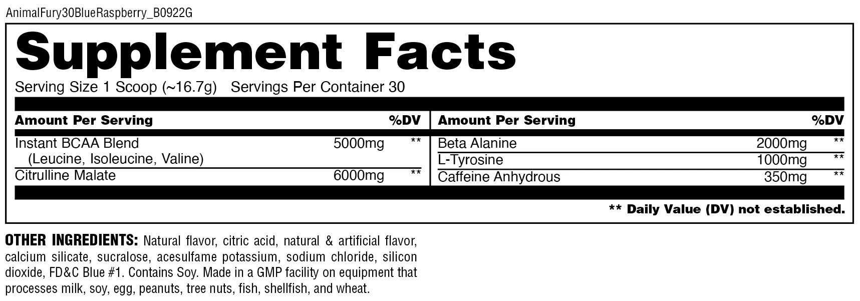 Animal Fury, un suplemento pre-entrenamiento potente y práctico, está formulado con 350 mg de cafeína anhidra y malato de citrulina para aumentar el óxido nitroso, beta-alanina, L-tirosina y BCAA en cada cucharada. Entrena más duro de lo que creías posible con Animal Fury, potente y de excelente sabor, diseñado tanto para hombres como para mujeres.